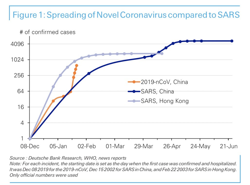 Deutsche Bank reckons that the Coronovirus has spread faster than SARS.Ā This twitter thread by Dr. Eric Feigl-Ding examining the virality of coronavirus is worth reading, although it might send you off to buy a face mask.