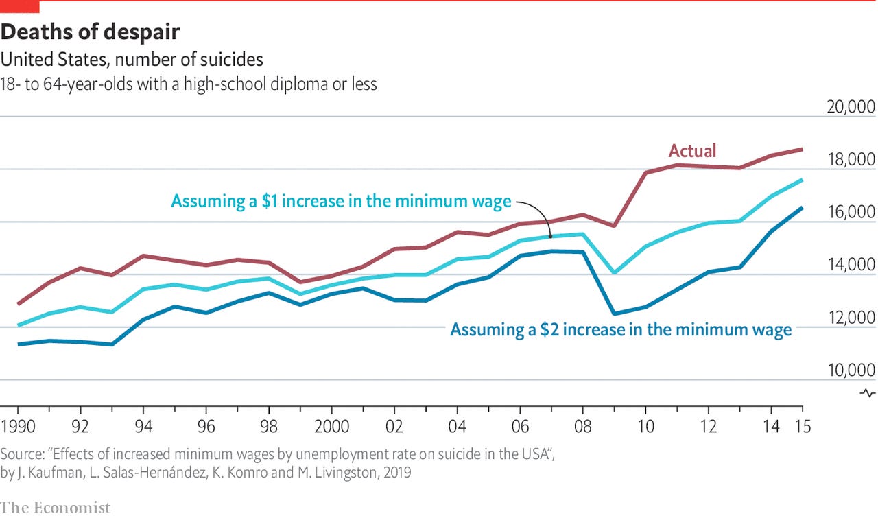 A new study has found that aĀ $1 increase in the minimum wage is associated with a 3.5 per cent decline in the suicide rateĀ among US adults with a high-school education or less. For an extra $2, 57,000 lives could have been saved between 1990 and 2015.