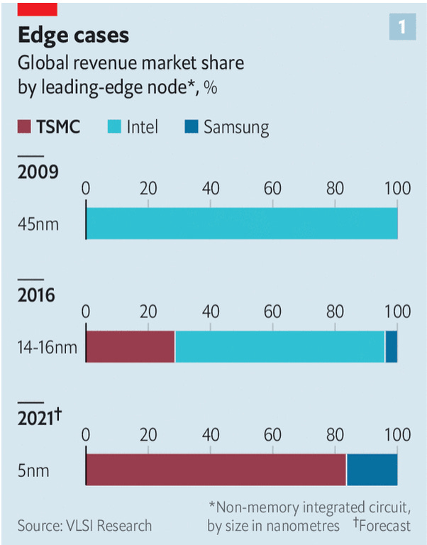 The geopolitics of semiconductors (and the global chip shortage) remains paramount. Taiwan Semiconductor Manufacturing Companyâs (TSMC) lead is nearly unchallenged. It took the firm only a decade to topple Intel. Its advantage may likely grow as the company continues to pour resources into expanding its edge. Via The Economist