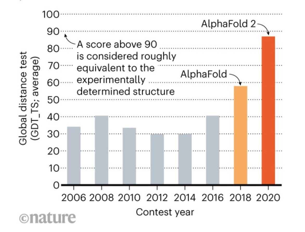DeepMind announced a breakthrough in the area of protein folding, which uses a proteinās DNA sequence to predict its three-dimensional structure. With this new ability, we can better understand the building blocks of cells and enable advanced drug discovery. This is a huge scientific and industrial milestone. Between 2018 and 2020, Alphafold has gone from impressive to superhuman ā and proving that machine learning approaches can solve the folding problem.