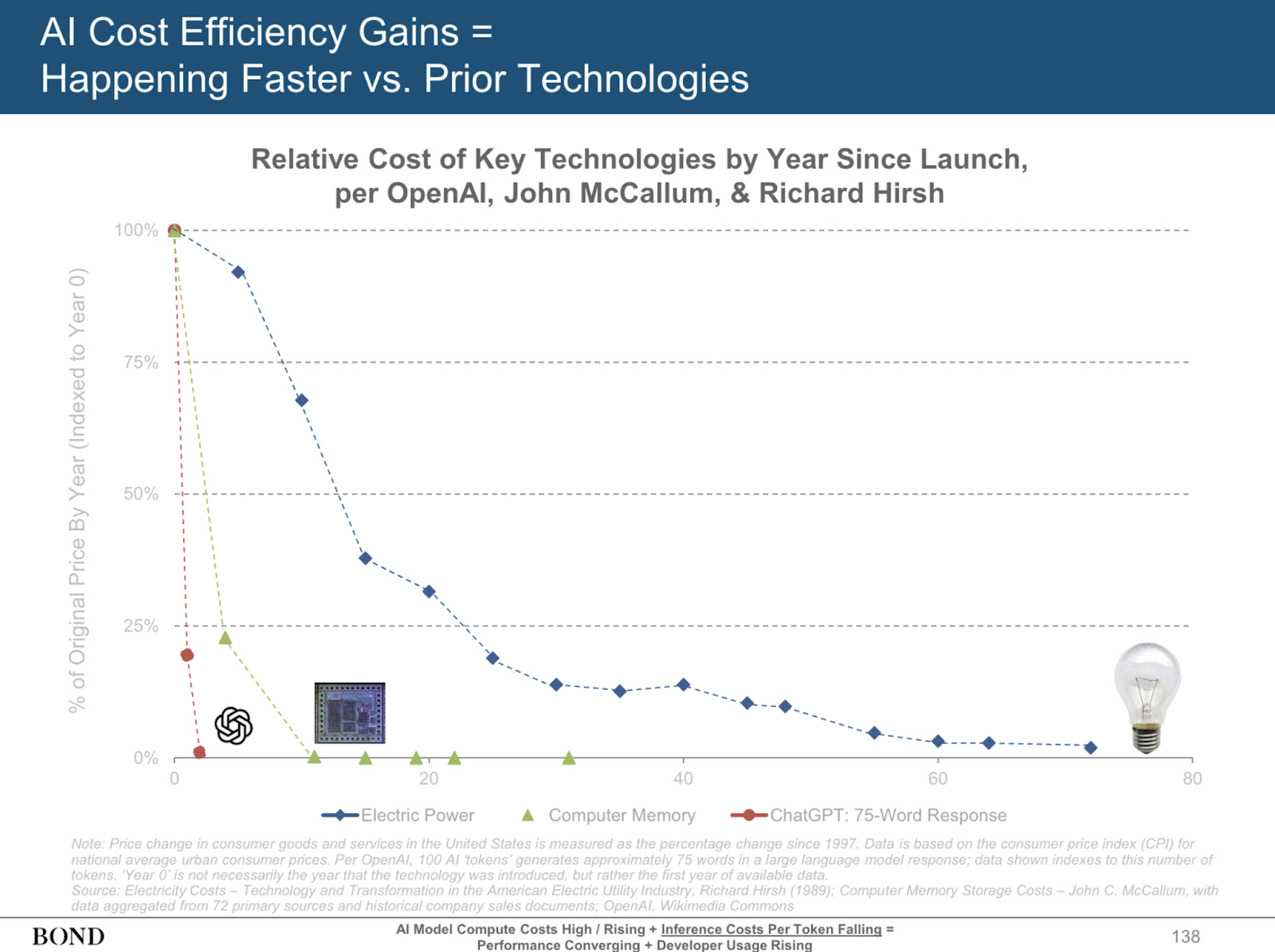 Consider ChatGPT’s inference prices, which have roughly halved every six months—outpacing even the historical cost declines in DRAM and solar power. This steep drop stems from relentless algorithmic improvements and fierce competition among providers. Lower prices in turn drive wider adoption: the cheaper an AI agent becomes, the more extensively it can be deployed. (Though clearly there is still room for improvement—I recently burned through $80 of Replit credits in a single evening.)