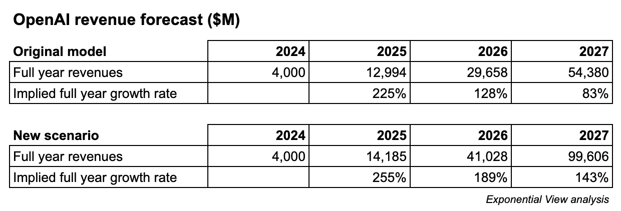 The nature of the subscription business that OpenAI runs will help us make better assessments on where the firmâs revenue trajectory will go. Exponential Viewâs current model for OpenAI had it nudging $13 billion in revenue by the end of 2025. We knew from our modelling and various leaks that the first half of the yearâs revenue totalled $4.3 billion.