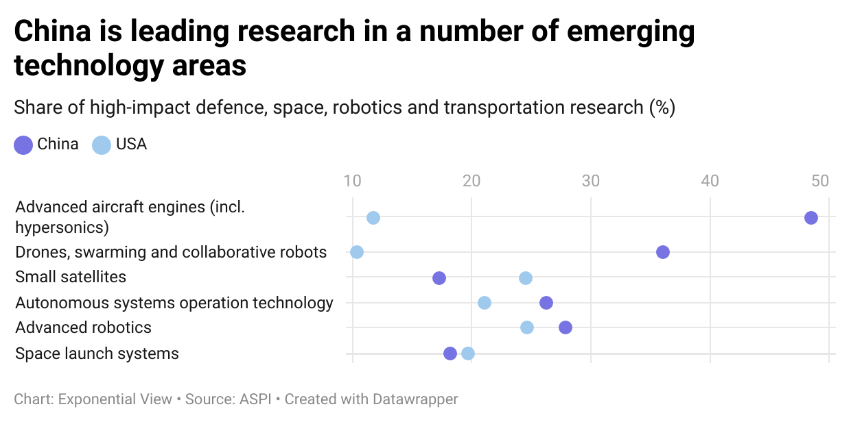 Furthermore, China has positioned itself as the front-runner in emerging technology areas like advanced materials, artificial intelligence, and quantum computing. The Australian Strategic Policy Institute identifies China as leading the world in research on 37 out of 44 critical technologies - a concern for the US considering many of these technologies have immense defence capabilities (for example hypersonic missiles, where China has the lead).
