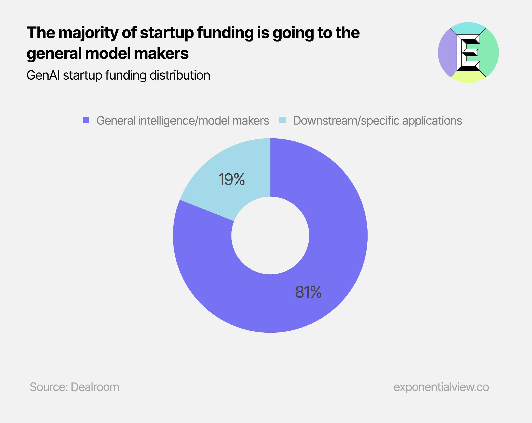 A closer examination of startup funding distribution reveals that 81% is allocated to model makers—companies responsible for creating the base models, such as OpenAI and DeepMind.