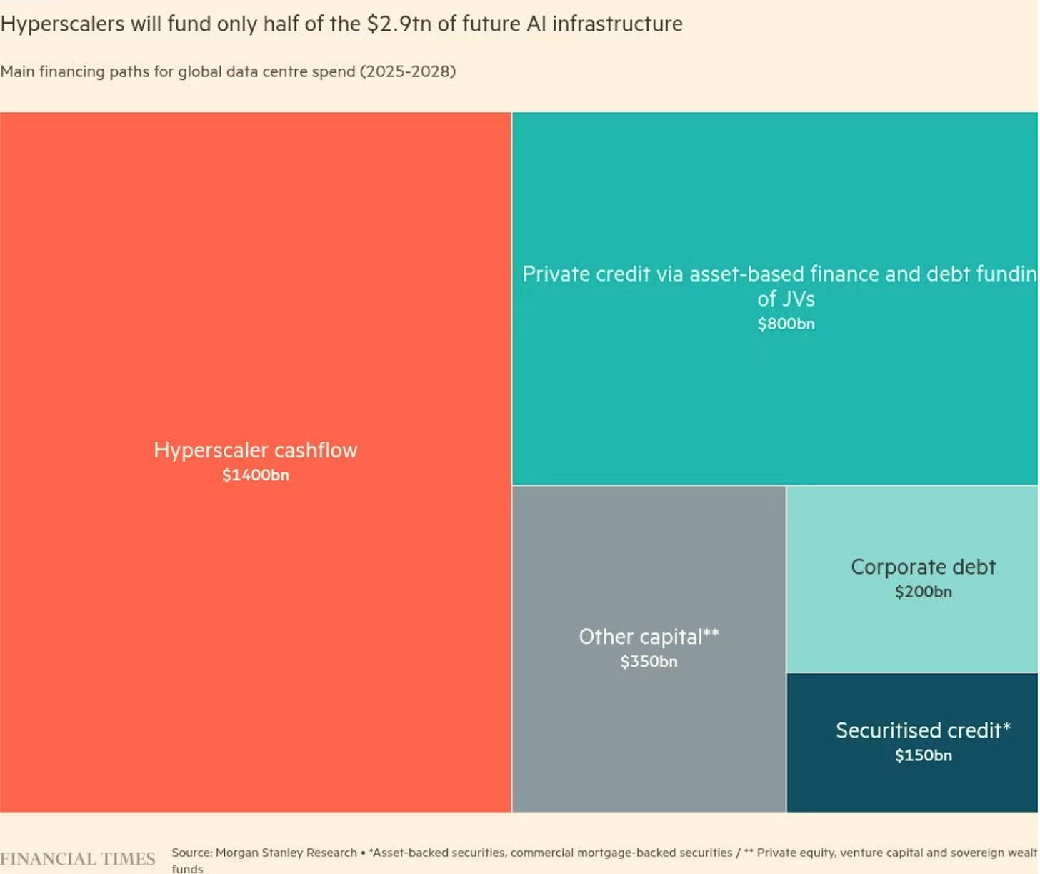 Data centers ↑ Morgan Stanley expects global spending on data centers to hit nearly $3 trillion between now and 2029 – about the size of France’s economy. Approximately half of this is expected to come from Big Tech capex.