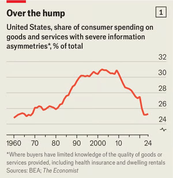 Asymmetric markets β AI is chipping away at markets where sellers know more than buyers (healthcare, mortgages, services) by helping people read contracts, compare prices and push back when treated unfairly. 25% of US consumer spending lies in these markets.