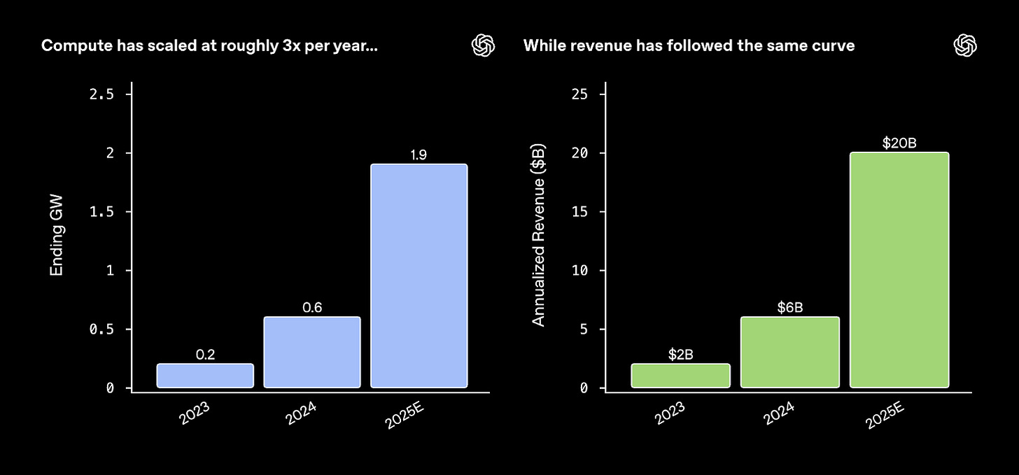 Revenue follows compute ↑ OpenAI shared that compute scaled ~3x YoY from 2023 through 2025, while annualized revenue climbed from $2 billion to $20 billion – a near 1:1 correlation. It’s to be seen if this is a durable law or a boom artifact.