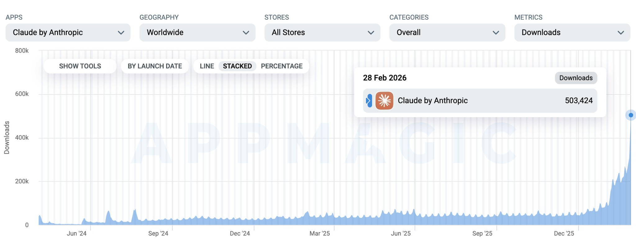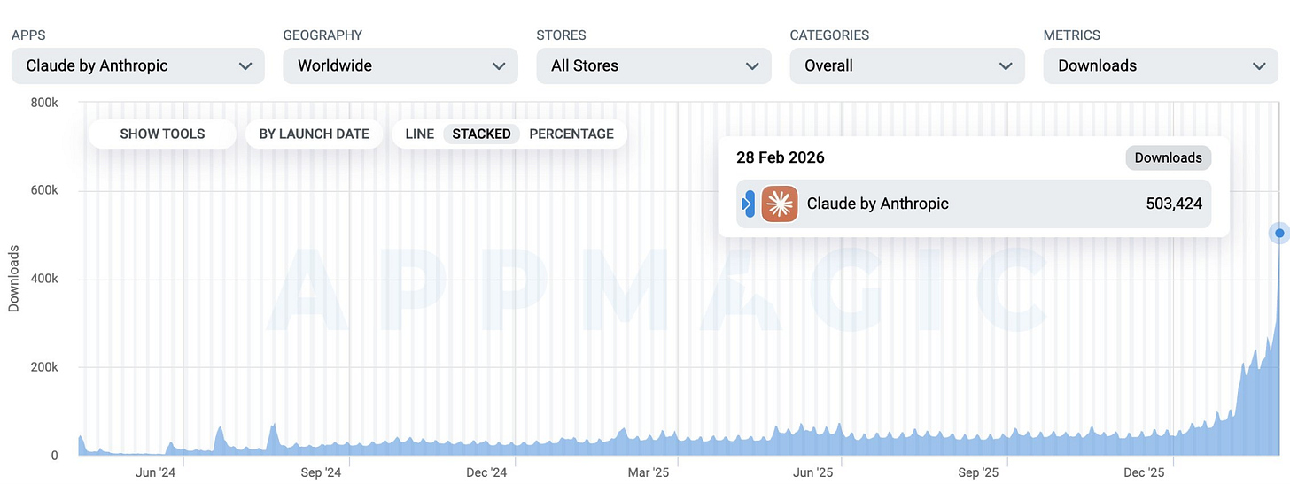 Switching it up โ Claudeโs mobile app saw over 500,000 downloads on Saturday โ its biggest day on record.