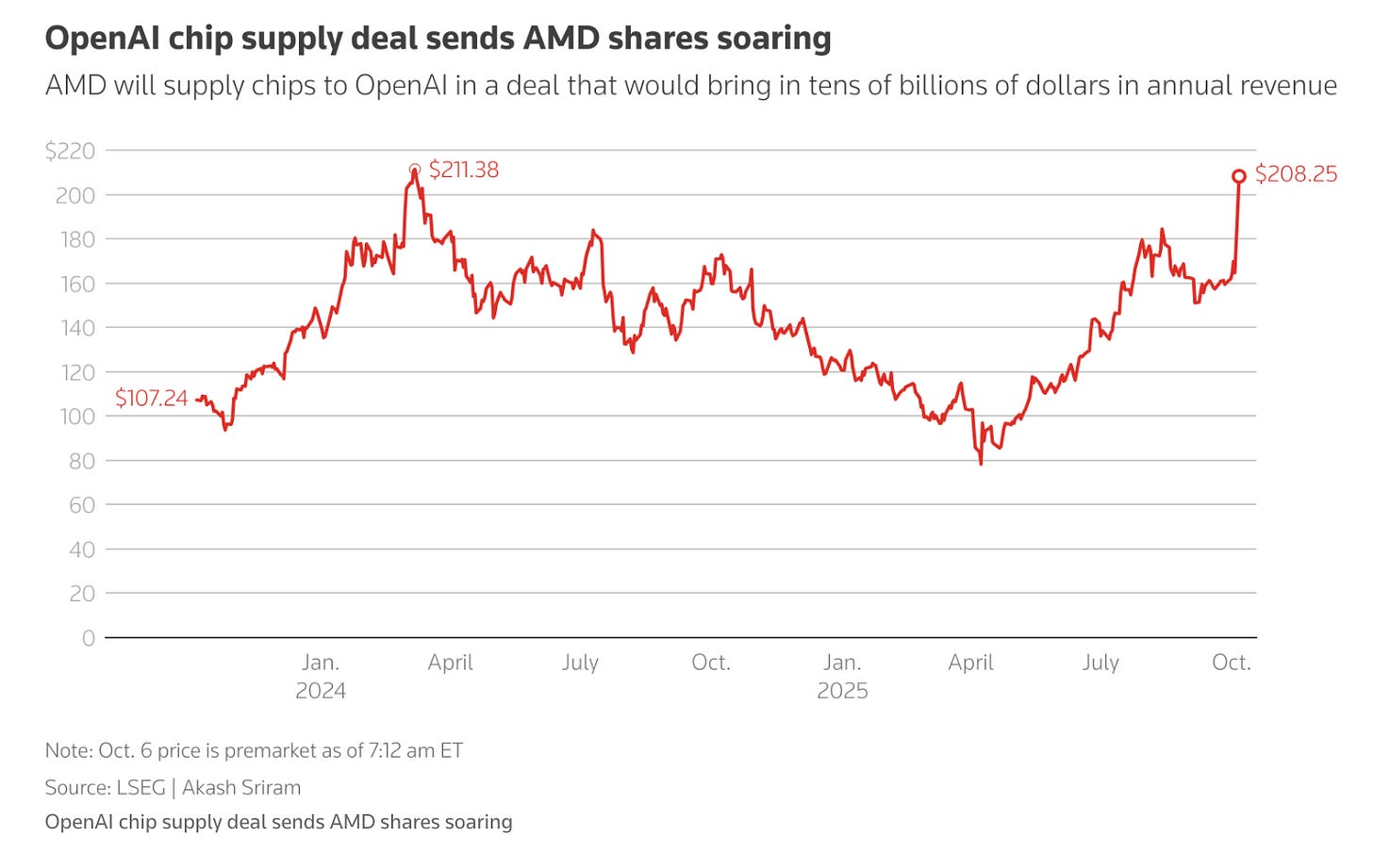 Equity-for-silicon β OpenAI will buy hundreds of thousands of AMD chips, equivalent to six gigawatts of compute capacity or roughly the maximum output of six full-size nuclear reactors. OpenAI will receive an option to acquire up to 10% of AMD.