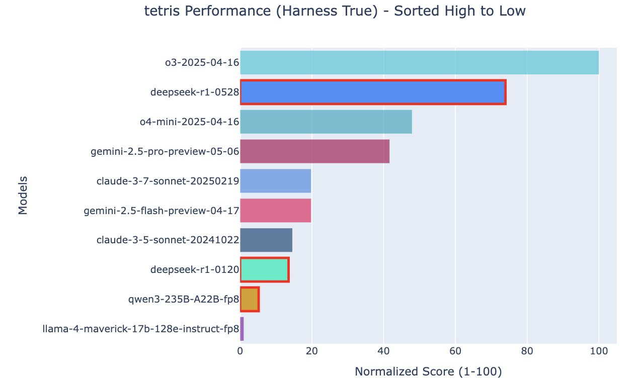 Open-source can game β DeepSeek-R1 now rivals o3 in reasoning games like Tetris, and Qwen3-235B beats Gemini-Flash-2.5 in Candy Crushβshrinking the proprietary gap.