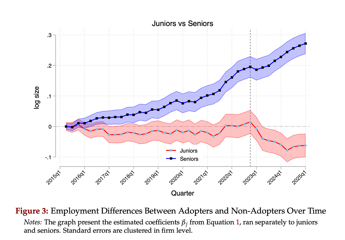 Two more papers came into my view this week on AI and youth employment. First is a piece of research by Harvard economists that looked at 285,000 US firms and 62 million workers to find that junior hiring among AI-adopting firms was down by 22% starting in early 2023 relative to non-adopters, while senior employment continued growing.