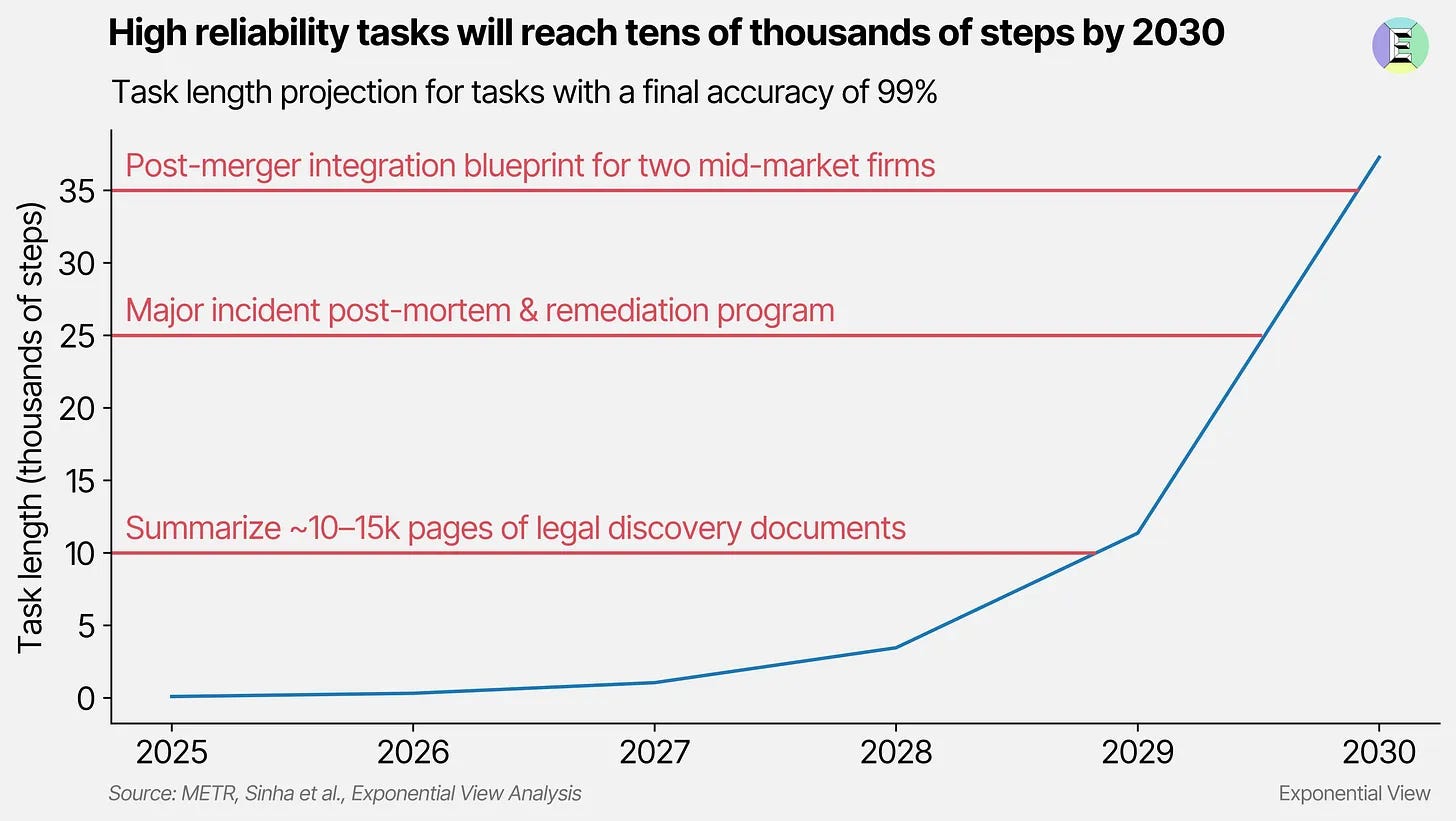 This week, we shared our estimates for the 99% step-length – the number of actions an AI system can take at near-perfect reliability before a human must intervene. Today’s frontier systems reliably manage around 100 steps at that threshold. By our estimates, the number could exceed 10,000 by 2029. A couple of years later, they might have between 3x and 10x that range. At that scale, an AI system could operate for weeks, potentially months, without supervision.
