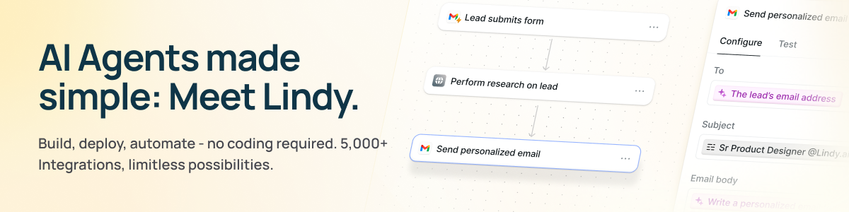 Your next hire won’t be human – it will be AI. Lindy lets businesses create AI agents with just a prompt. These AI employees handle sales, support, and ops 24/7, so you can focus on growth.