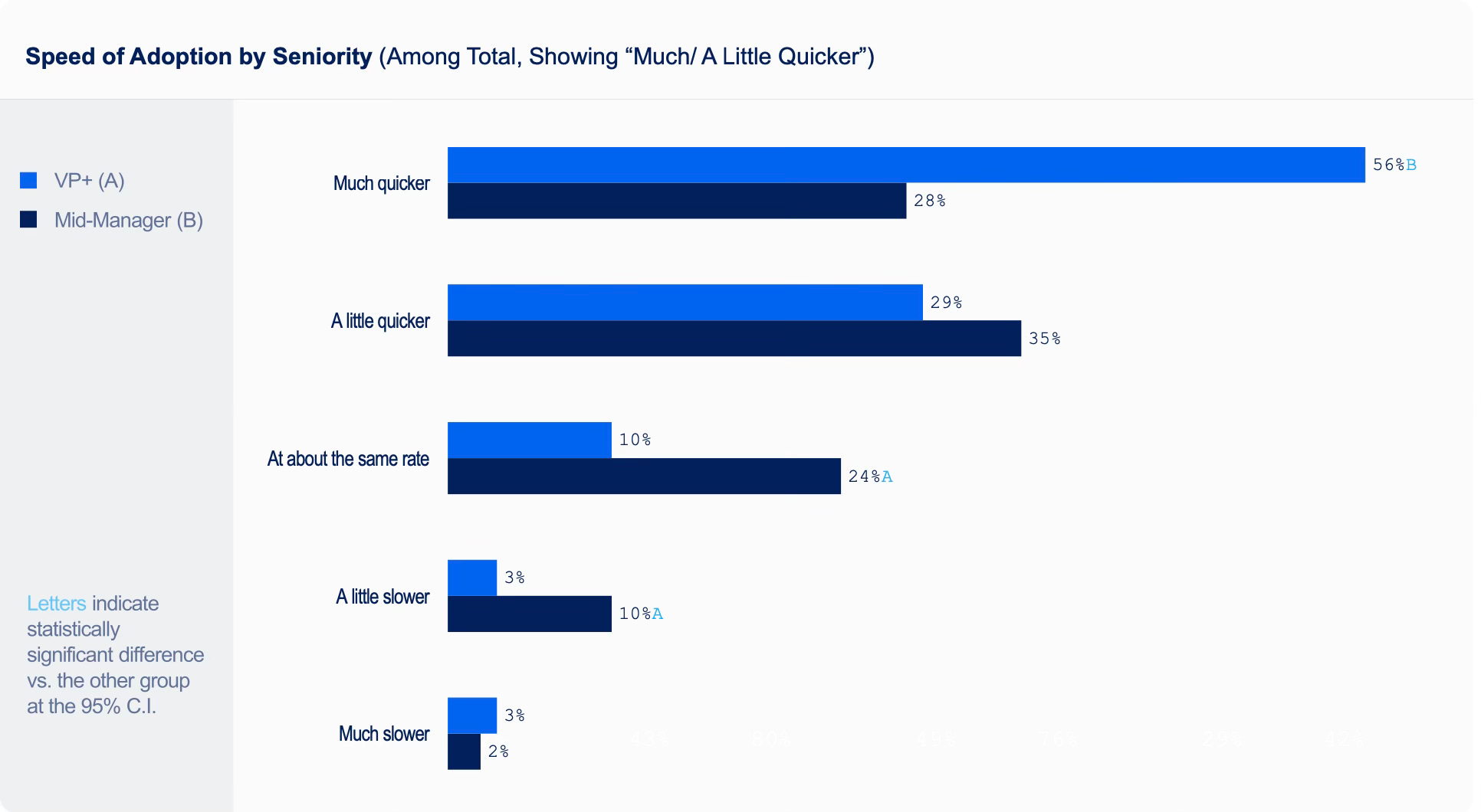 It’s remarkable that most firms are seeing positive returns within three years of ChatGPT’s debut. Usage is deepening rapidly – 82% of respondents engage with generative AI weekly, 46% daily – but the pattern is uneven. Middle managers lag their executives, and hiring expectations vary widely across levels. Whether this early surge can sustain itself remains to be seen.