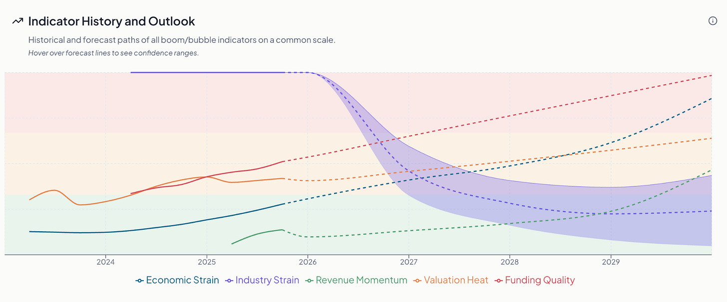 Boom/Bubble dashboard update: Weāve added projected trajectories for each of the five key indicators between now and 2029 ā the indicator history and outlook is interactive and you can access it for free on the Boom/Bubble website.