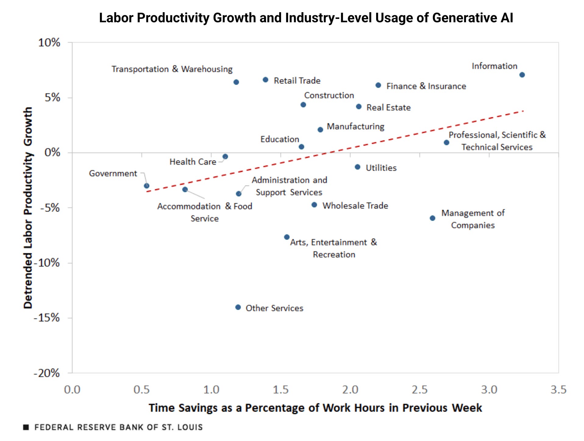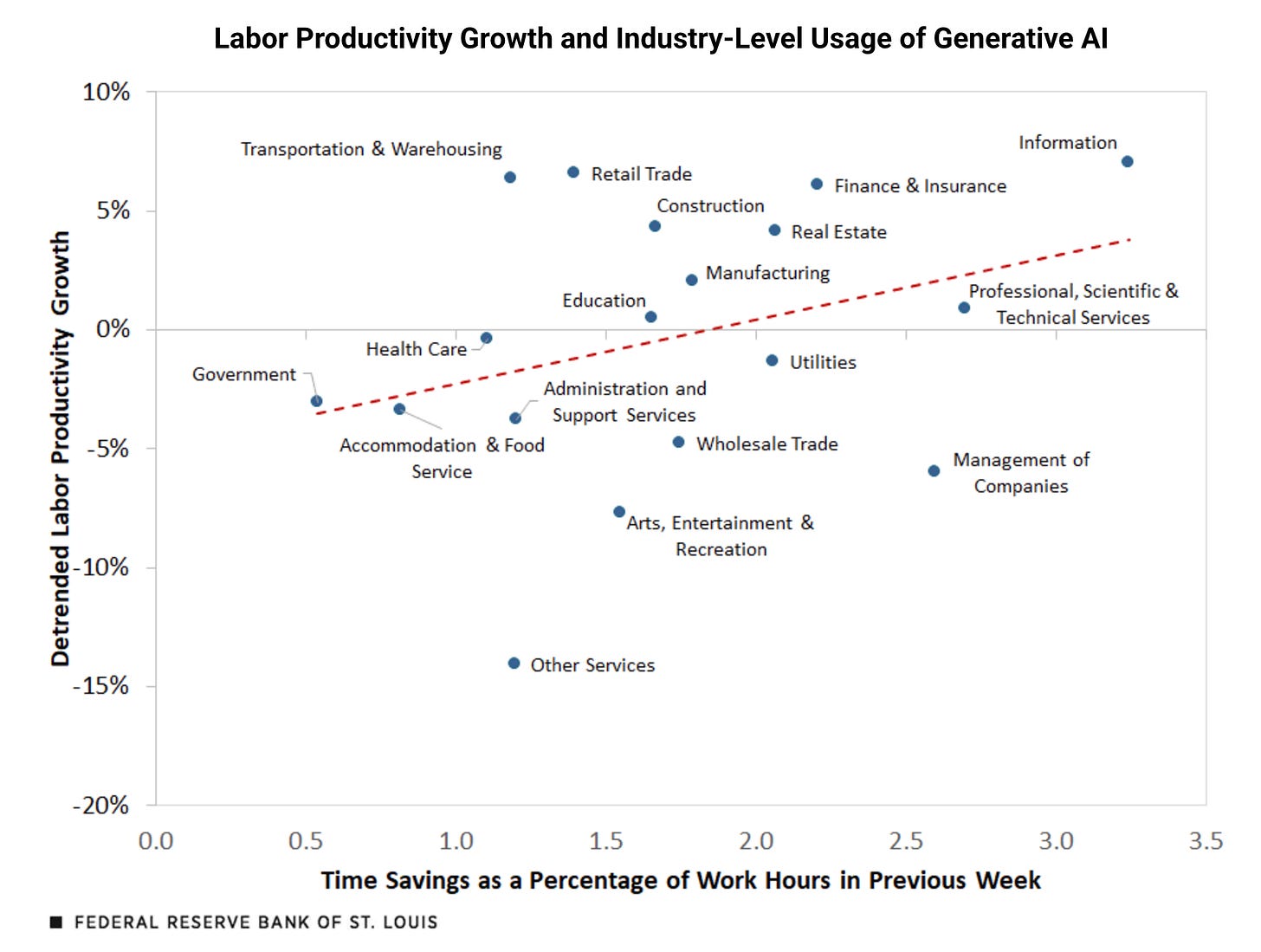 The St. Louis FED estimates that generative AI may have increased labor productivity by up to 1.3% ā and has had positive effects on industry-level productivity. While that may sound modest, a sustained 1.3% annual productivity boost would be transformative1.