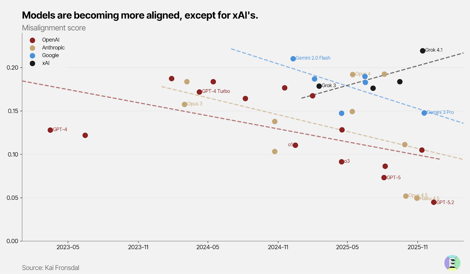 Meanwhile, the one company whose models have become more misaligned over time, xAI, has encountered deepfake scandals, regulatory attention, and enterprise users unwilling to deploy for consequential work.