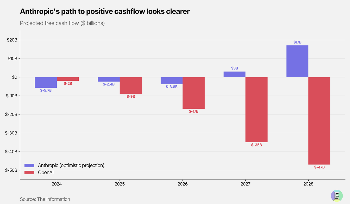OpenAI needs a new alpha. Their main advantage was being the first mover. But the alpha has shifted from models to agents and there, Anthropic moved first properly with Claude Code. It’s hard to see how OpenAI can sustain its projection of $110 billion in free cash outflow through 2028 in a market it isn’t clearly winning. Anthropic, meanwhile, projects burning only a tenth of what OpenAI will before turning cashflow positive in 2027 (although their cloud costs for running models ended up 23% higher in 2025 than forecast).