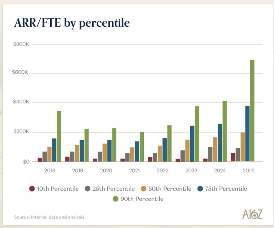 Something is certainly happening. In the past four years, revenue per employee in the top quintile of software companies has tripled, breaking away from the median. These leaders are most likely AI-native firms, or those which have leant fully into the technology.