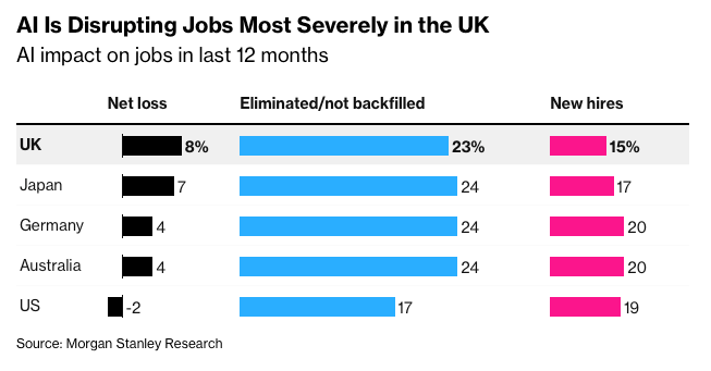 Morgan Stanley claims the UK experienced an 8% net job loss due to AI in the last twelve months among firms using the technology for at least a year. Japan: 7%. Germany and Australia: 4%. The US, the outlier with a 2% gain. Early-career roles go first, two to five years of experience.