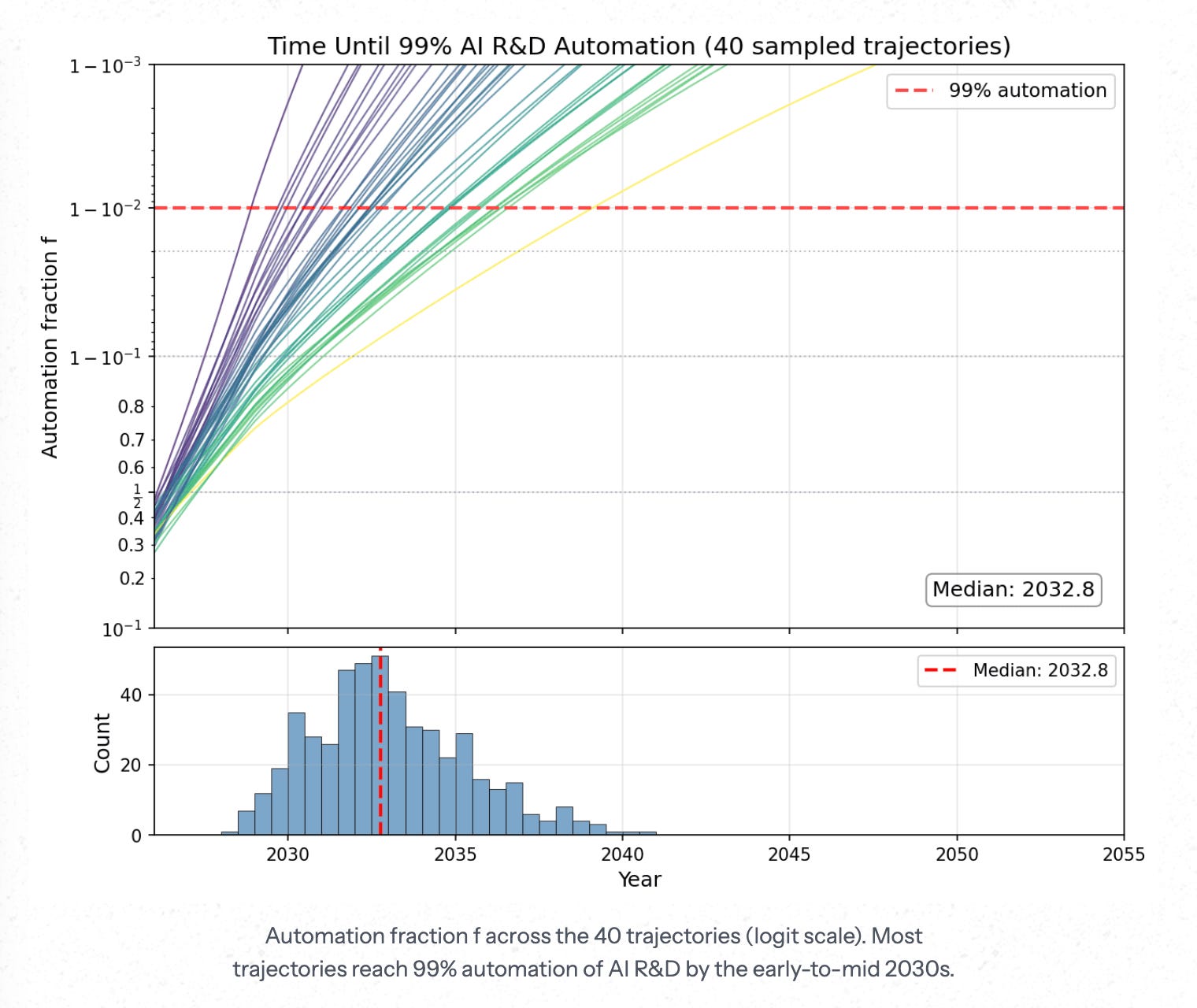 METR’s Thomas Kwa published a model this week projecting almost-full automation of AI R&D around 2032 . The model’s central constraint is diminishing returns: each additional improvement in AI coding capability becomes progressively harder to achieve. The timeline to full automation depends on how steep those diminishing returns are; if they are strong, progress could stretch out by years.
