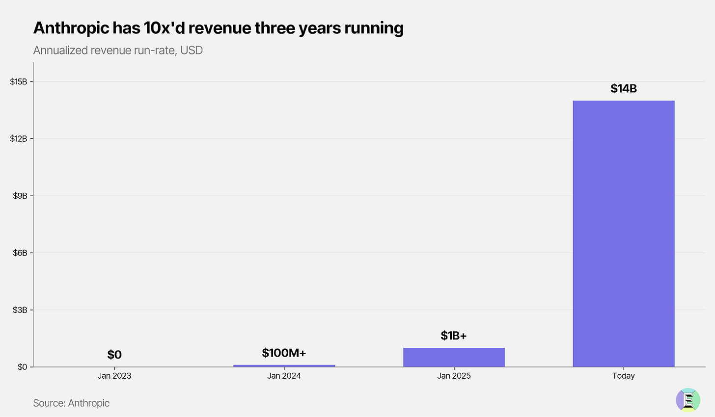 Anthropic’s latest numbers are astonishing. The firm's revenues grew roughly tenfold in each of the last three years, reaching a $14 billion annualised run rate – about 900% growth per year, sustained for three consecutive years. 900%.