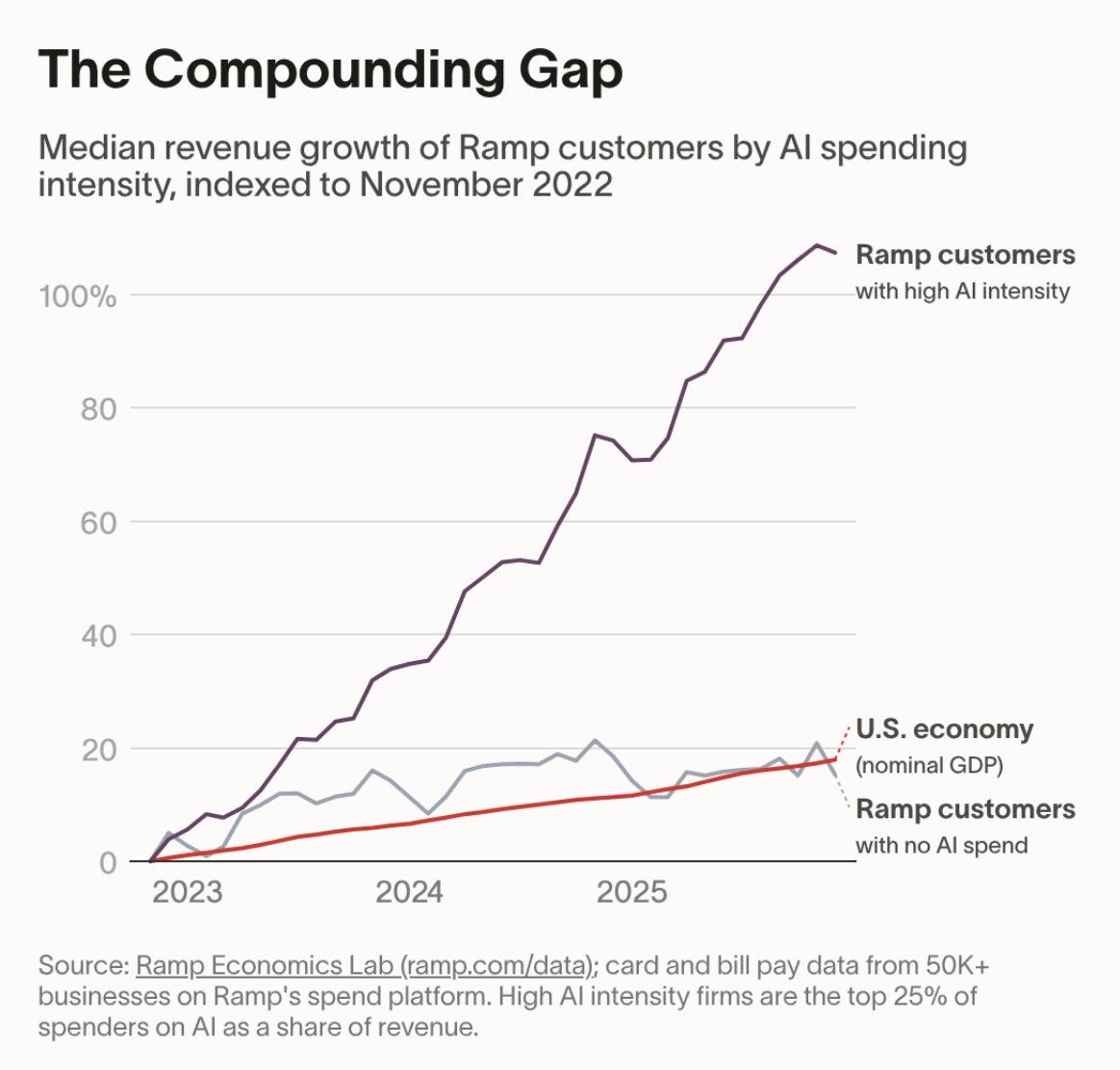 Learning compounds as the AI frontier advances, and those who move earliest and fastest have an advantage. Ramp, a fintech platform, spotted the compounding gap in its customer base – since 2023, top-quartile AI spenders on Ramp have more than doubled revenue; the bottom quartile has remained flat.