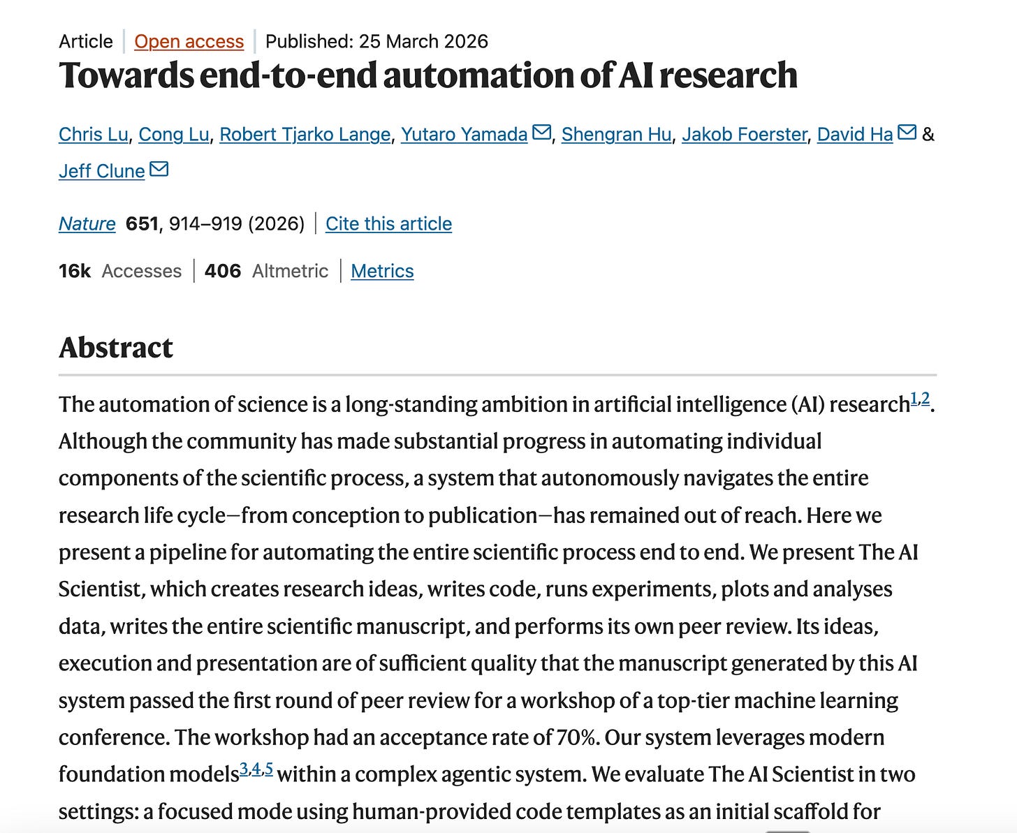The paper about the system has now been published in Nature. One of the system’s outputs passed the first round of peer review at an ICLR workshop in 2025, without the reviewers knowing it had been authored by AI1.