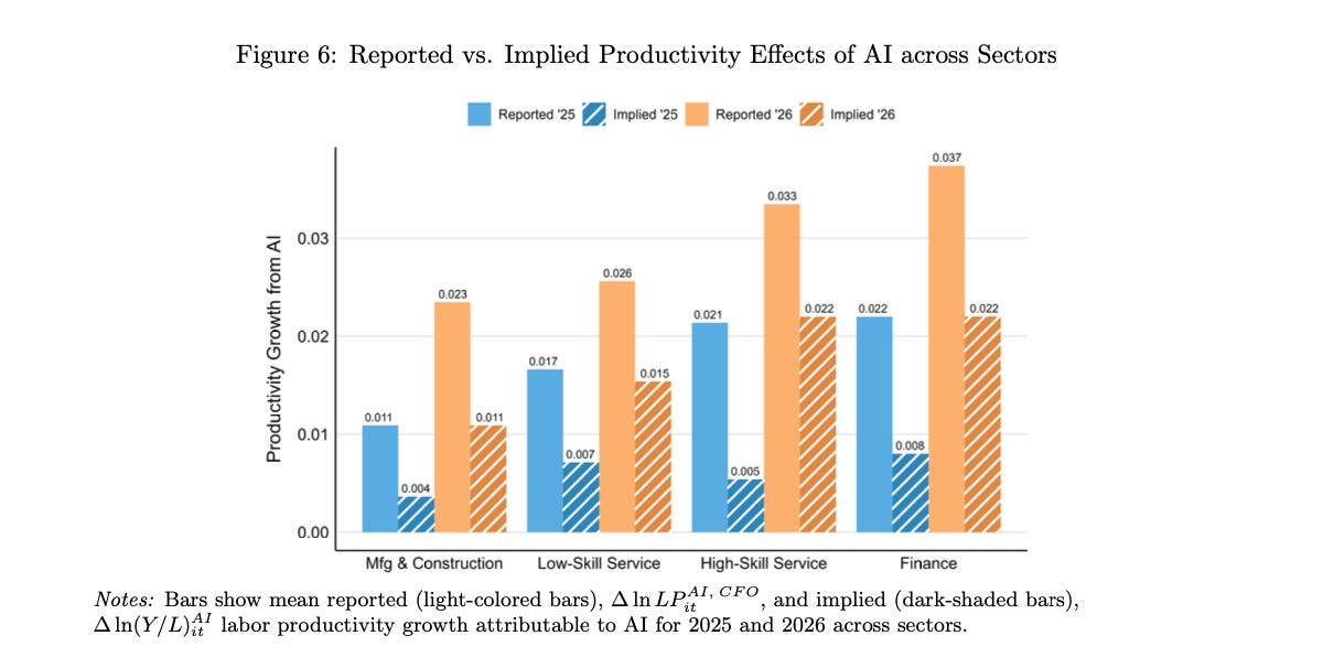 Some of this is visible in economic data. The National Bureau of Economic Research’s (NBER) study of nearly 750 executives shows that reallocation of labor is happening; AI use is “substituting the routine clerical activities while complementing higher-skill analytical and managerial work.” Measured output gains still lag what those leaders are feeling, but there is a belief that AI is giving them more than the numbers show.