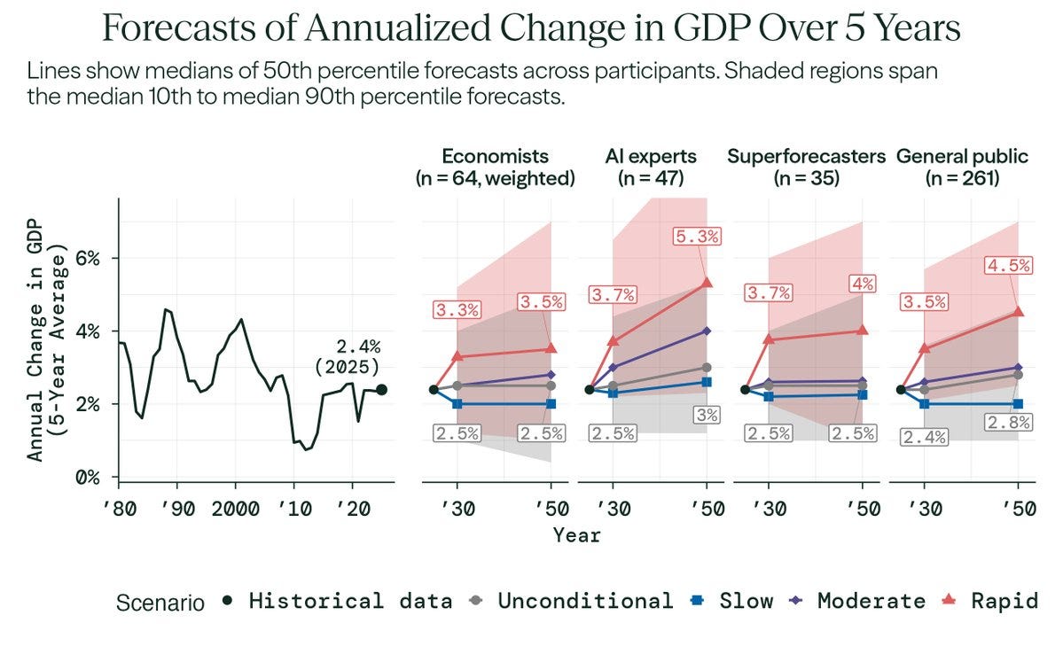 Economists forecast AI will add 1-1.5 percentage points to annual US growth by 2050 under a rapid AI progress scenario. They also believe there will be 10 million fewer jobs and inequality at its highest since 1939.