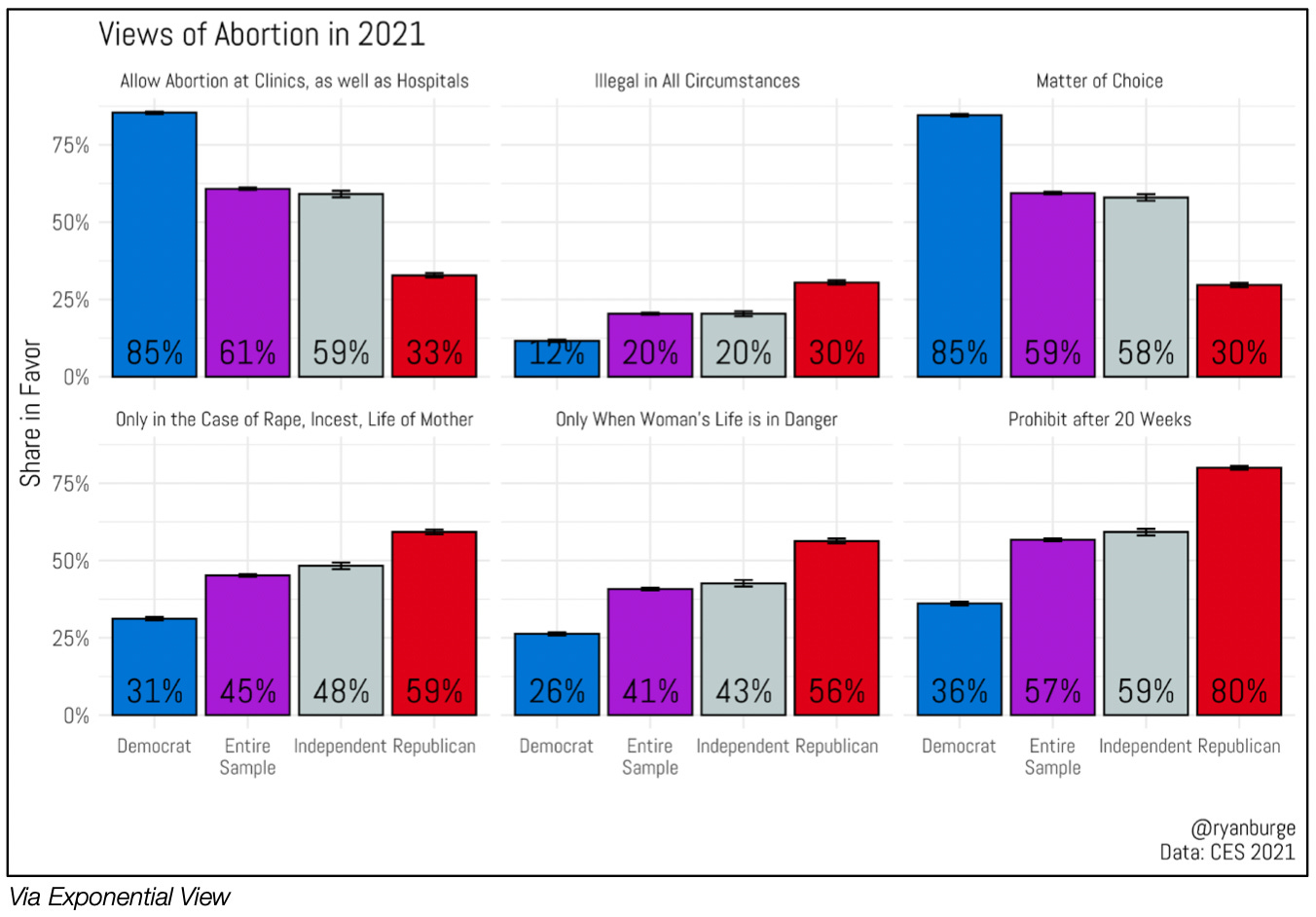 Americans are on balance (the purple line shows the sample) more liberal than fundamental in their views on abortion.