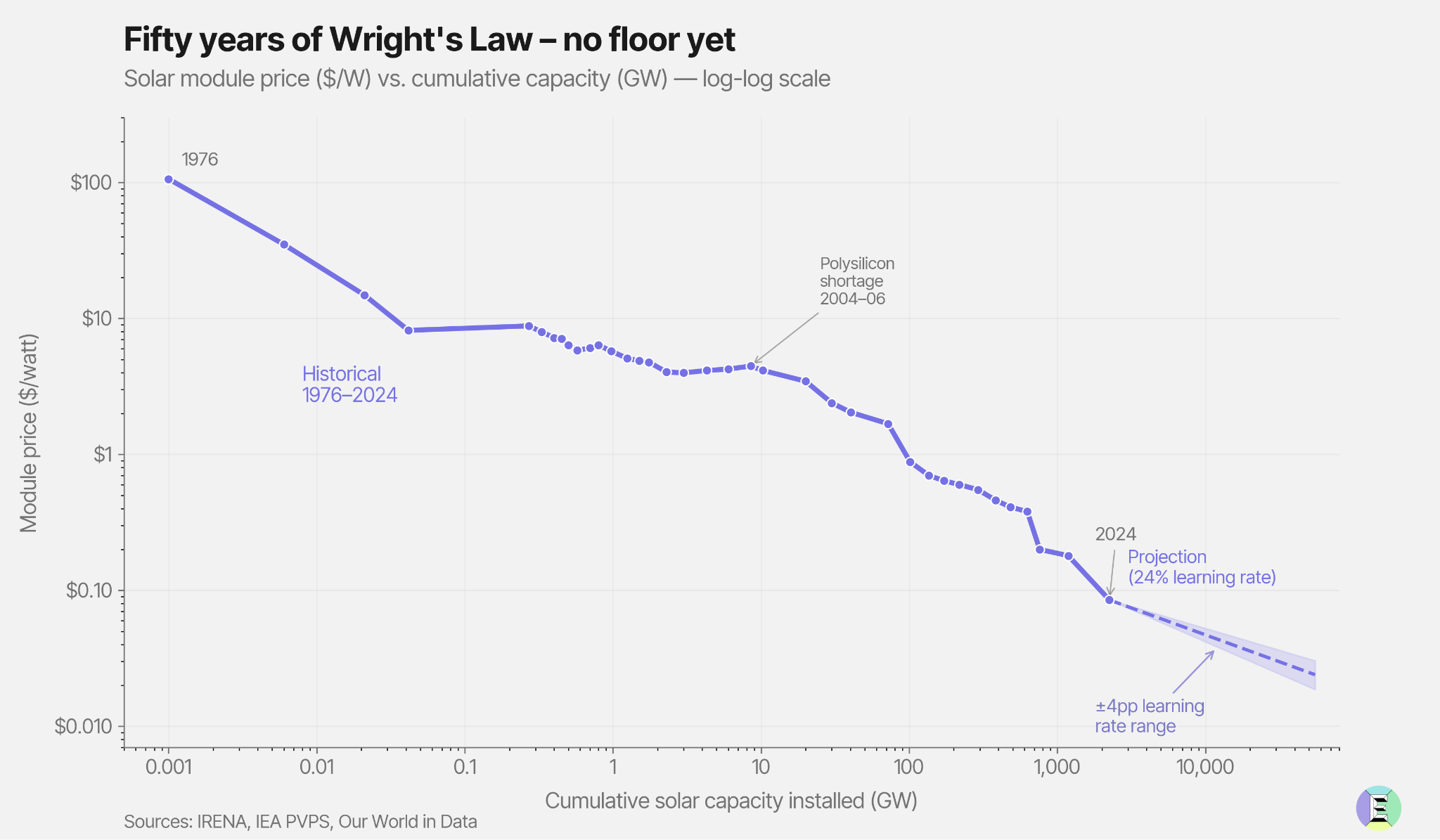 Solar photovoltaic panels operate on Wrightâs Law: for every doubling of cumulative production, costs fall by a fixed percentage. This is a result of âlearningâ that happens when you make a lot of something â workers get faster, designs are refined, error rates are lower, waste is reduced and more steps get automated. The more youâve made, the cheaper the next unit becomes. That learning rate for solar has held at 23.7% per doubling over the last 48 years,2 confirmed across multiple independent studies.