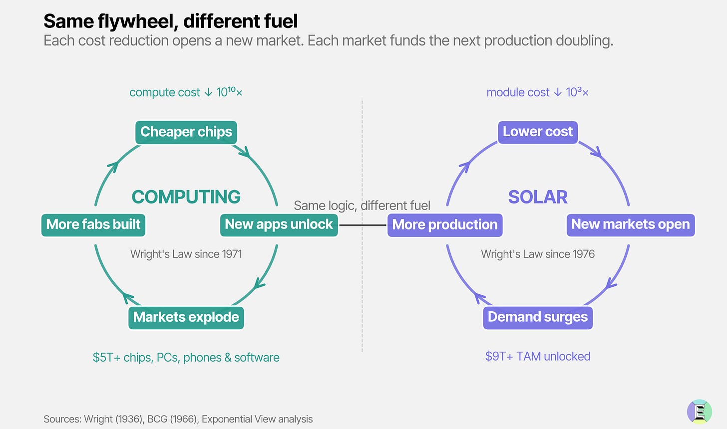You can see that the story of solar is not just a story of an energy transition â it is what we call the solar supercycle, the self-reinforcing loop in which every cost reduction opens a new market and every new market funds the next cost reduction, which opens new markets.