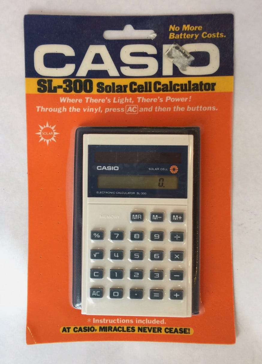 But the flywheel was turning. By the late 1970s, panels had fallen to around $76 per watt, cheap enough for Casio to put them on calculators and for off-grid telecom towers in remote locations. This expanded the market, cumulative production doubled and doubled again, and prices came down. By the 1990s, they were affordable enough for rural electrification programs across the developing world.