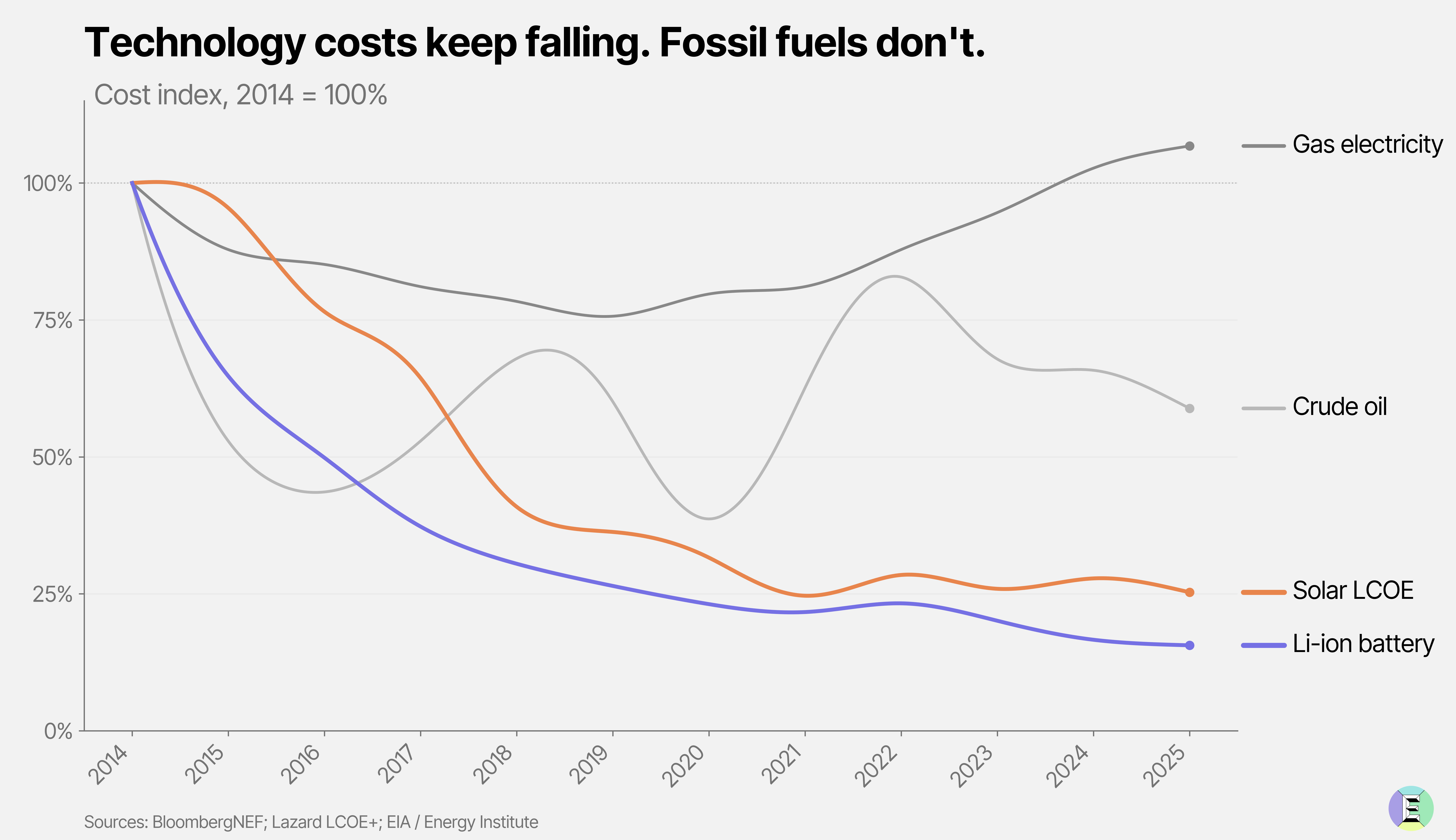 Over the past century, coal costs roughly the same in real terms as in the 1880s. Oil has doubled, natural gas has doubled. The only certainty about fossil fuel prices is volatility. All the while, solarâs price curve moves in one direction, down. For the 85% of solar panels made in China, manufacturing capacity now stands at 1,045 GW, almost double the actual production in 2024 of 587 GW.