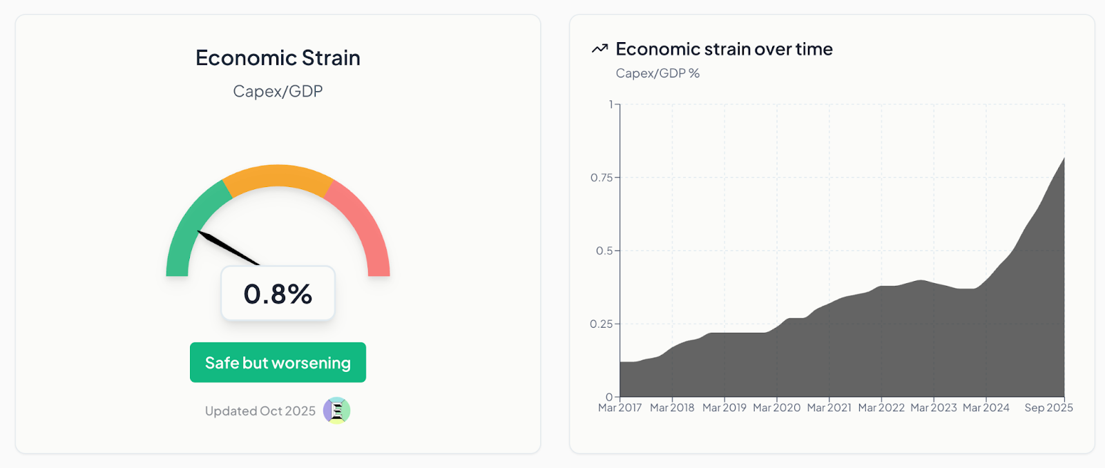 Since we last updated the dashboard, economic strain has increased but remains in safe territory. Google, Microsoft and Meta increased their collective capex by 11% compared to the previous quarter. Hyperscalersâ spending on AI infrastructure shows no sign of slowing.