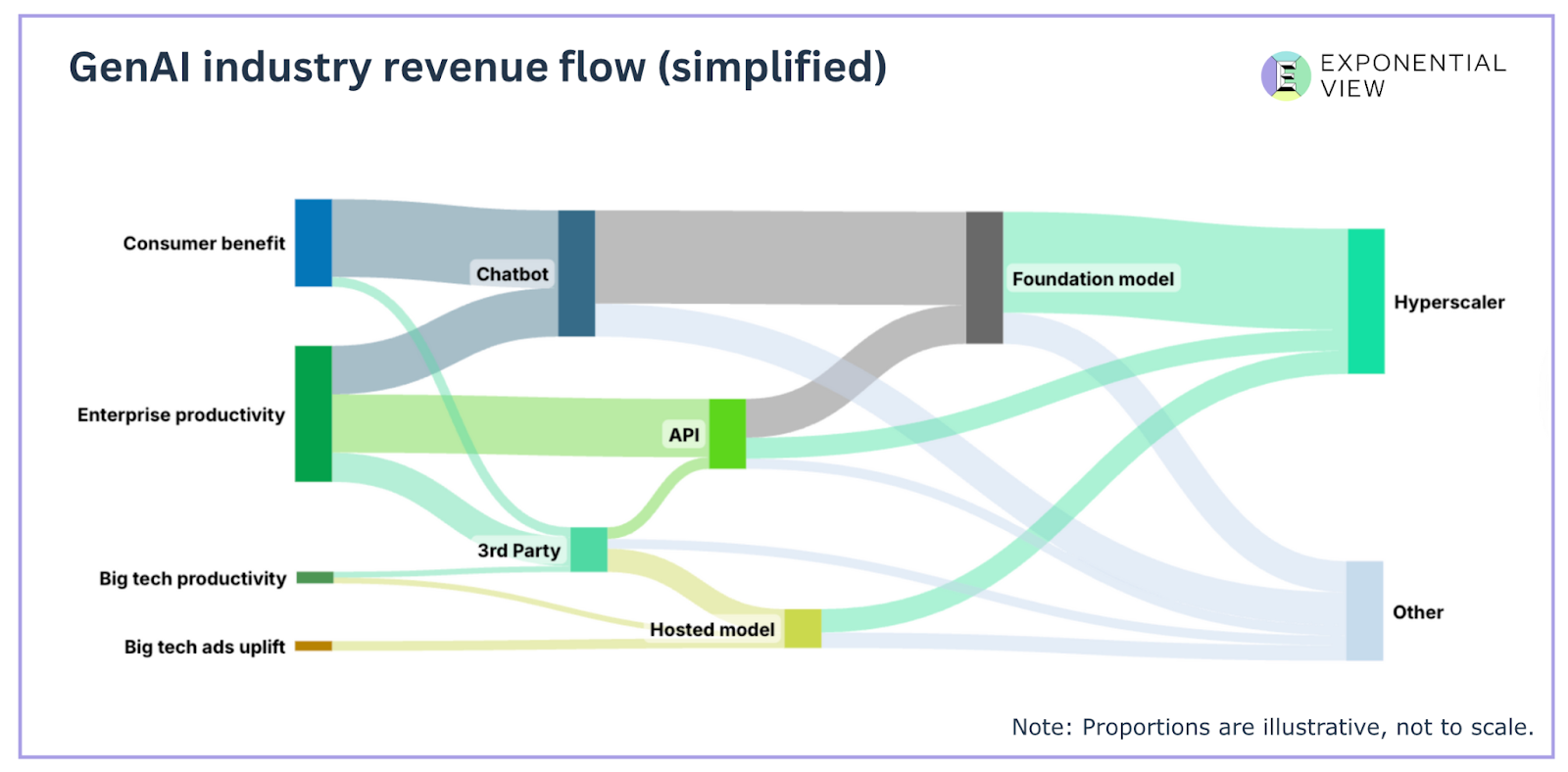 This was one of the most challenging pieces of analysis to assemble, as reliable revenue data in the generativeâAI sector remains scarce and fragmented. Most companies disclose little detail, and what does exist is often inflated, duplicated or buried within broader cloud and software lines. Our model tackles this by tracing only deâduplicated revenue: money actually changing hands for generativeâAI products and services. That means triangulating filings, disclosures and secondary datasets to isolate the signal. The result is a conservative but more realistic picture of the sectorâs underlying economics. The simplified Sankey diagram below shows how we think about those flows.